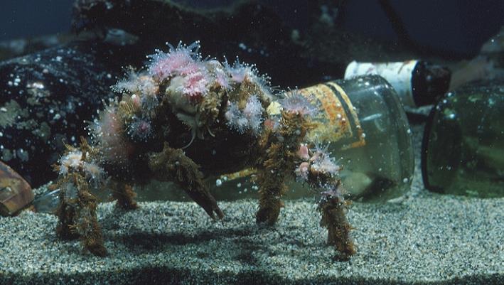 For first causes one need only look to the Decorator Crab. You see, the crab, all by itself, is a typical crab: an arthropod invertebrate with a hard carapace, spikes on its exoskeleton, segmented body with jointed limbs, five pairs of legs, the first pair of legs usually containing chelae (the familiar pincers and claws). There are all kinds of crabs in salt, fresh, and brackish water. They tend to be well adapted to their environment. But they are also tasty and high in protein value, thus having a number of predators. So the Decorator Crab has determined that what evolution has provided is not enough–it borrows features and items from its environment to enhance its capabilities as a defense mechanism. There is a price to being a Decorator Crab. Encrustations also become encumbrances. Where crabs have learned to enhance their protections, for example by attaching toxic sponges and anemones, these enhancements may also have made them complaisant because, unlike most crabs, Decorator Crabs don’t tend to scurry from crevice to crevice, but tend to walk awkwardly and more slowing than many of their cousins in the typical sideways crab gait. This behavior makes them interesting, popular, and comical subjects in both public and private aquaria.