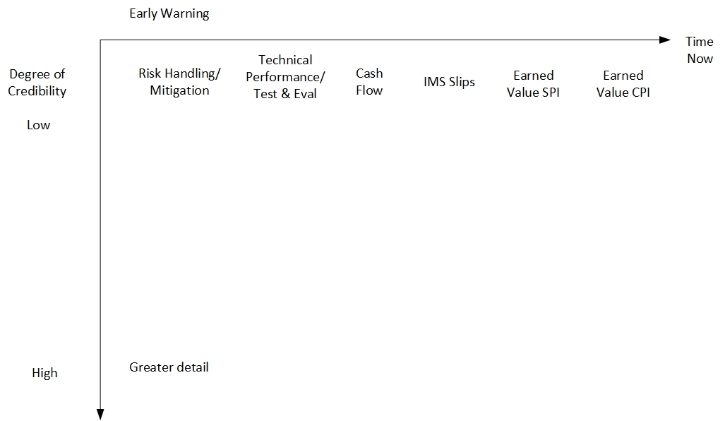 Thus, there are at least two main aspects of data that are important in understanding the utility of project management: early warning/predictiveness and credibility/traceability/fidelity. The chart attached below gives a rough back-of-the-envelope outline of this point, with some proposed elements, though this list is not intended to be exhaustive.